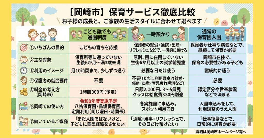 岡崎市の案内では、対象は保育所、幼稚園、認定こども園、地域型保育事業所、企業主導型保育事業所に通っていない、0歳6か月から満3歳未満の子どもです。
